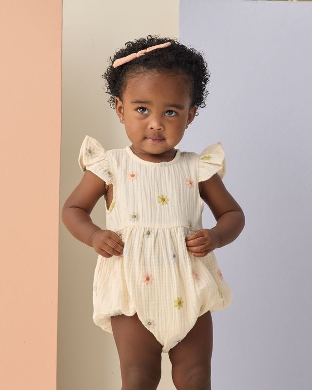 | This woven one-piece romper features ruffle flutter details at the arm openings, a loose bubble shape with coconut buttons at the back, and snaps at the bottom opening for easy changing. Featuring our 'embroidered daisies' print on our 'natural' hue. Care: Machine wash cold. Tumble dry low. Minor shrinkage may occur if tumble dried. Made of 100% cotton. |